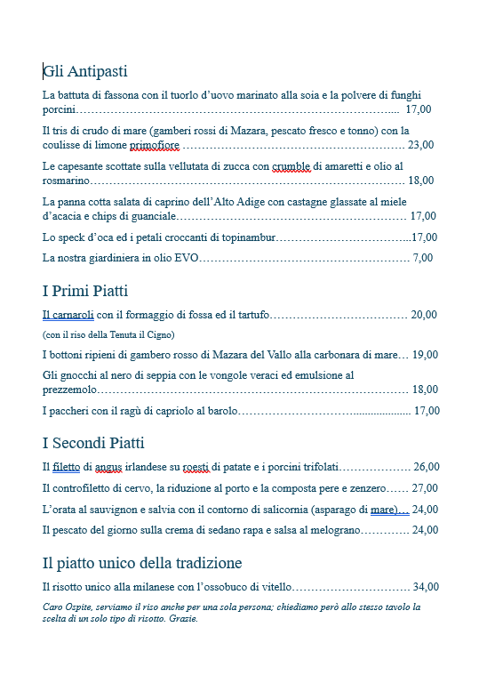 Aperto tutte le sere da lunedì a sabato e la domenica a pranzo. Chiuso la domenica sera. Consulta il MENU’ valido fino al mese di novembre.